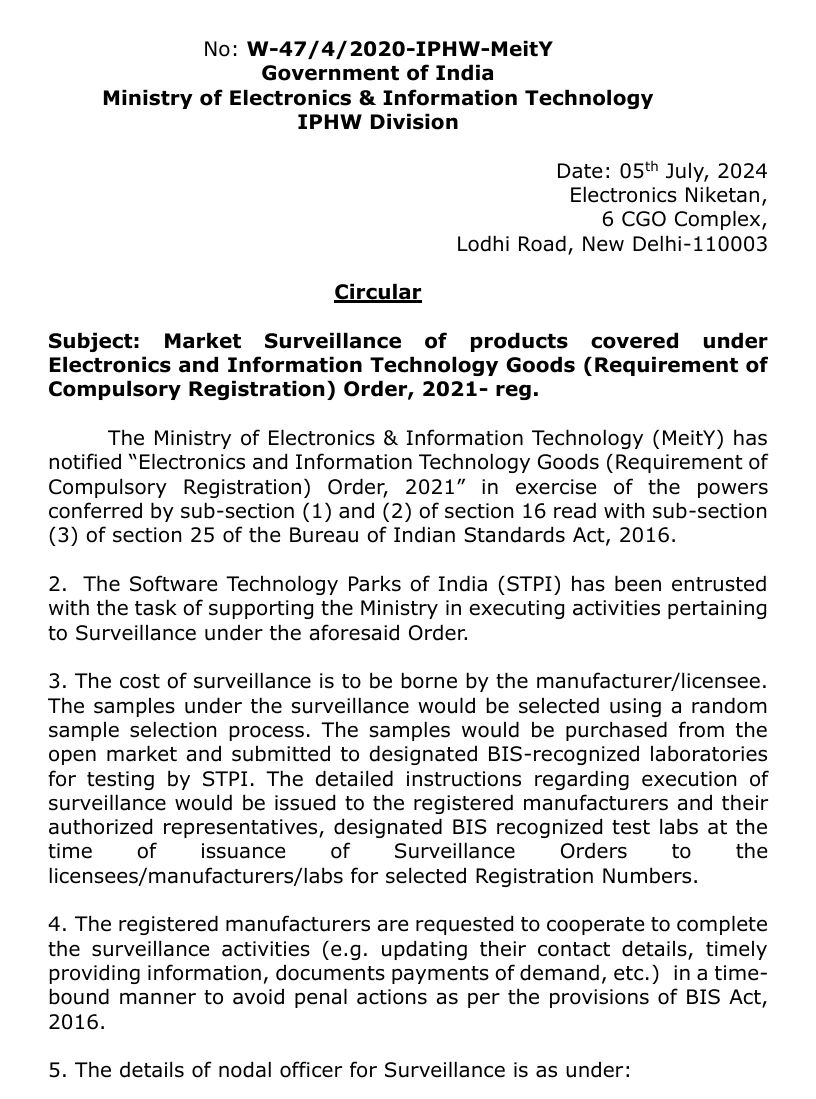 2024年7月5日,印度政府电子和信息技术部Ministry of Electronics & Information Technology(简称MeitY)发布公文,宣布恢复由印度软件技术园区 STPI负责强制注册电子信息技术产品的市场抽检工作,制造商需留意 STIP 的通知,并配合抽检流程,以避免受到处罚。