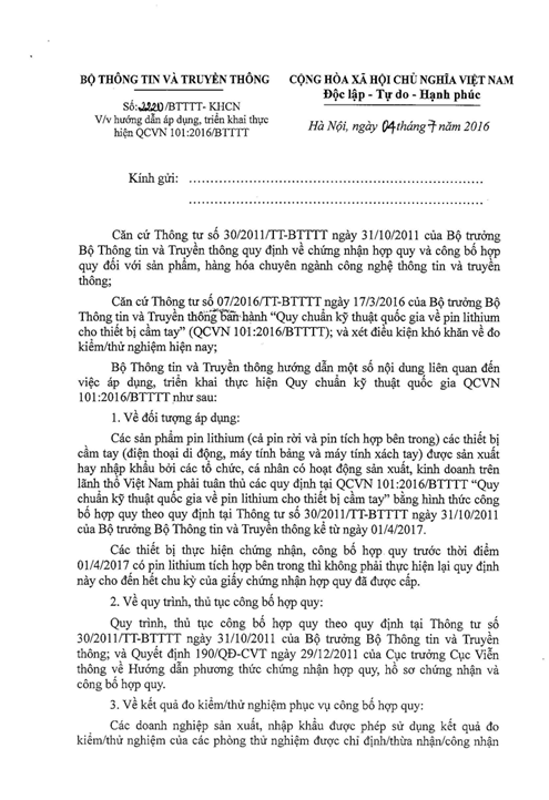 越南的MIC部门在2016年初发布过公告称,从今年10月1日起所有的锂电池,包括独立销售的和使用在终端成品(笔记本,平板,手机等)将会要求DOC证书(标准号: QCVN 101:2006/BTTTT)。以上产品在做越南MIC认证的时候也会被要求提供电池的DoC。